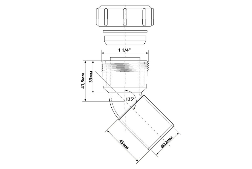 Колено McAlpine 45° с гайкой d32 мм полипропилен белый