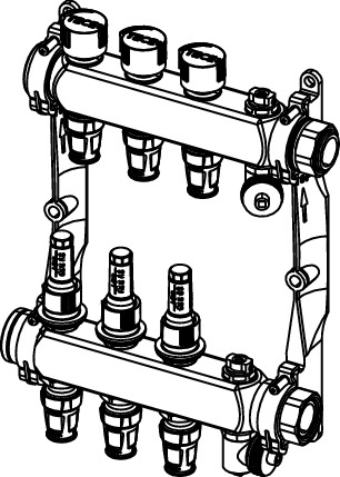 С кранами маевского ½". На входе интегрированные регуляторы потери теплоносителя предворительной настройкой 0,5-4л/мин. На выходе интегрирован клапан М 30 х 1,5мм. Также в коллектор вмонтированы дренажные клапаны для набора и спуска теплоносителя. Для крепления коллектора в комплекте присутствуют кронштейны с звукоизолирующими прокладками согласно с DIN 4109, винты и дюбеля.