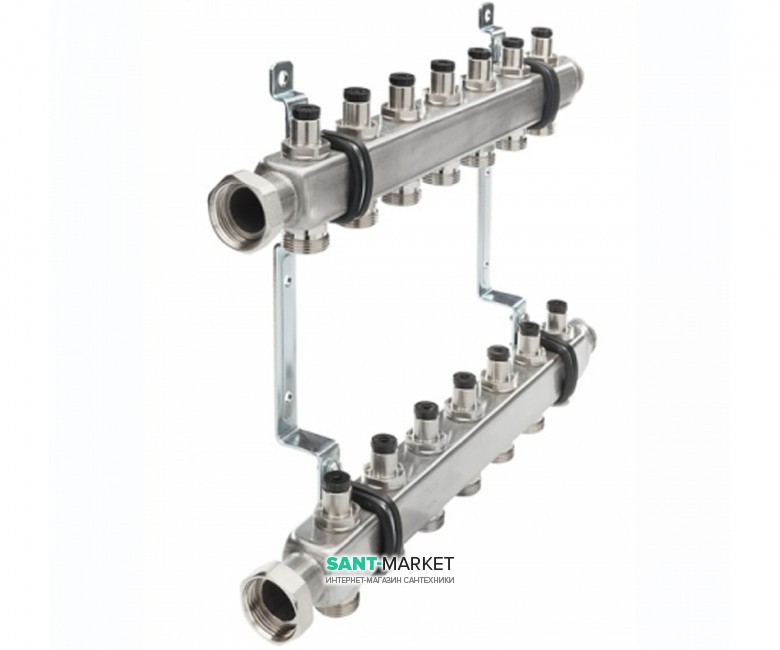 Коллектор для системы отопления с запорными вентилями в сборе, 4 контура, 1"- 3/4" EK, нержавеющая сталь