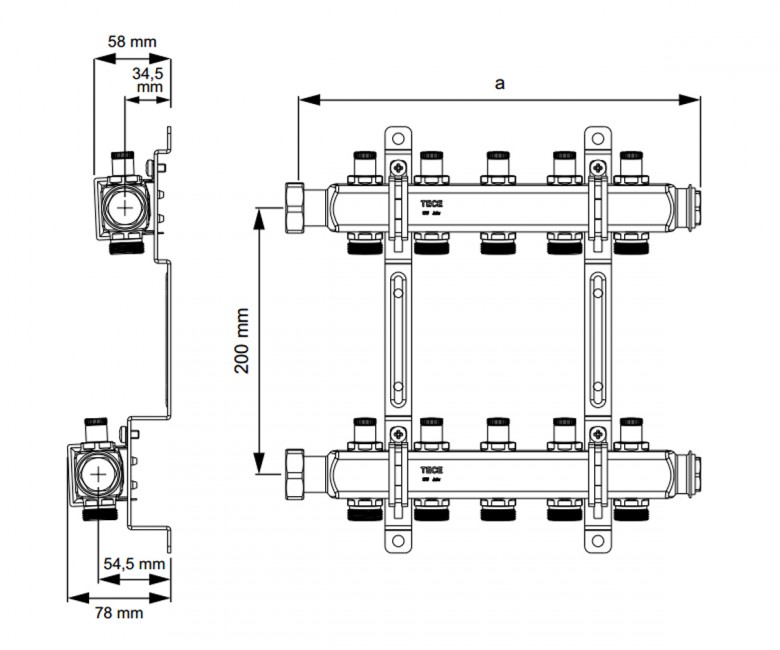 Коллектор изготовлен из профиля из нержавеющей стали прямоугольного сечения 40х1,5 мм, в соответствии с DIN EN 10088, с накидной гайкой 1" с торцевым уплотнением. Расстояние между отопительными контурами 50 мм.