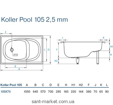 Ванна стальная Koller Pool прямоугольная 105х70 с сиденьем B05E2200E