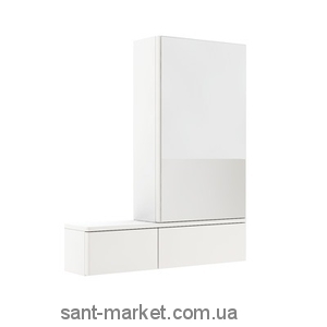 Шкафчик с одной распашной дверцей дополненной механизмом soft-close: внутри 2 регулируемые полки из ДСП, зеркало закреплено на фасадной панели. Под шкафчиком находится длинный пенал с двумя выдвижными ящичками.
