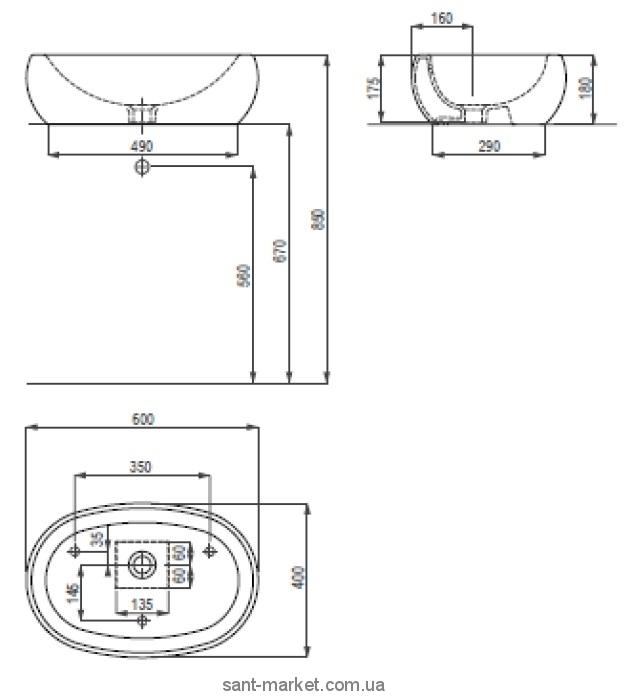 Тип монтажа: накладной на столешницу; материал корпуса: керамика; форма: овальная; перелив; комплектация: чаша (умывальник); цвет: белый; габариты (мм): 600х400х180.