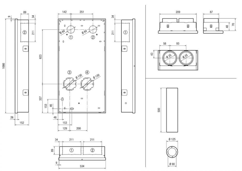 Комплект для монтажа в стену без отделки, для скрытого монтажа, включает в себя монтажный ящик (ширина x высота x глубина: 534 x 1066 x 152 мм) со встроенным шаблоном для сверления отверстий (колонковых скважин), двумя стенными втулками с теплоизоляцией и желобами для отвода конденсата (диаметр: 125 мм, длина: 500 мм) и двумя адаптерами стального листа WS 75 A для вентиляционного прибора с рекуперацией тепла WS 75 Powerbox H (0095.0646)