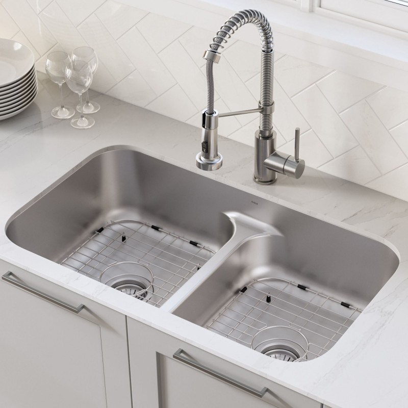 Комплект кухонный Kraus Ellis двойная мойка со смесителем и решеткой нержавеющая сталь KCA-1200