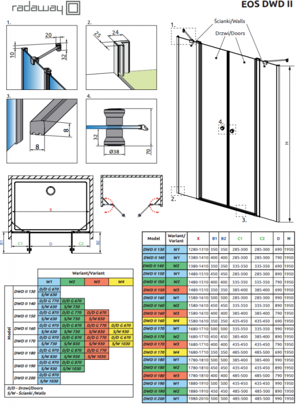 В заказе надо указать два номера артикулов: двери и стенок. Модель DWD можно заказать в нескольких вариантах - с более широким или узким входом.
