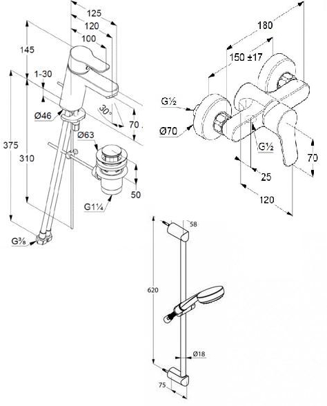 Представленный здесь набор Pure&Easy 378450565 от Kludi, состоит из врезного, однорычажного смесителя для раковины с донным клапаном Pure&Easy 70 372820565 с длиной стационарного излива в 12 см, настенного, однорычажного смесителя для душа Pure&Easy 378410565, и душевого гарнитура Logo 1S 6816005, состоящего в свою очередь из одноструйной душевой лейки с диаметром душевой поверхности в 9.6 см, держателя для душа, душевого шланга Logoflex длиной 160 см и крепежной штанги высотой 62 см.
