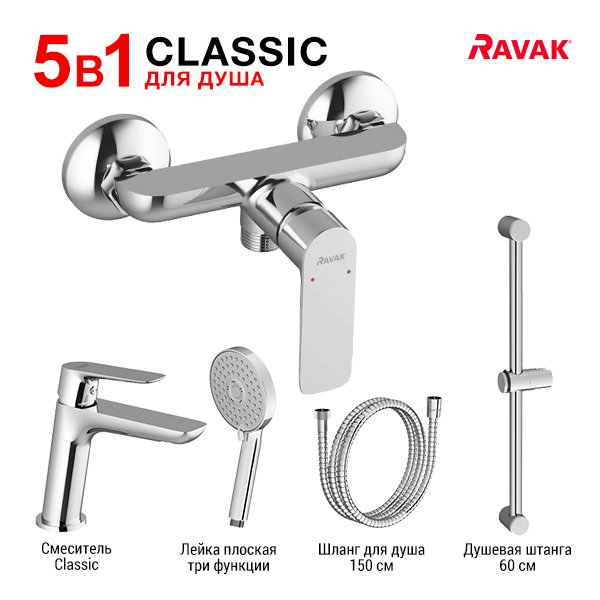 Комплект смесителей для ванной с душевым гарнитуром Ravak Classic 5 в 1 (CL 012 + CL 032 + 953.00 + 972.00 + 911.00) 70320253