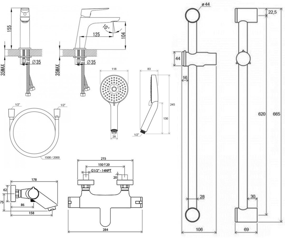 Комплект смесителей для ванной с душевым гарнитуром Ravak Termo 5 в 1 (HA 012,TE 022,953.00,972.00,914.00) 70320277