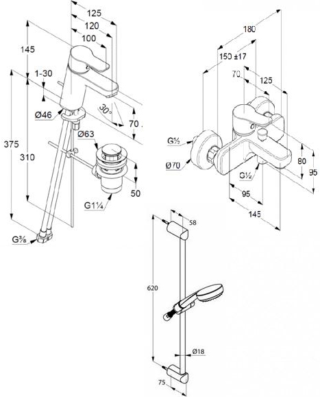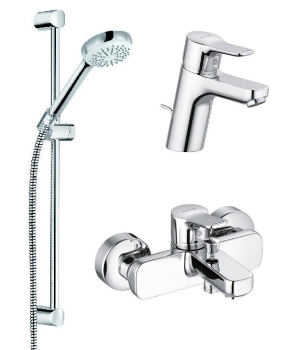 Представленный здесь набор Pure&Easy 376850565 от Kludi, состоит из врезного, однорычажного смесителя для раковины с донным клапаном Pure&Easy 70 372820565 с длиной стационарного излива в 12 см, настенного, однорычажного смесителя для ванны Pure&Easy 376810565 с длиной стационарного излива в 14.5 см, и душевого гарнитура Logo 1S 6816005, состоящего в свою очередь из одноструйной душевой лейки с диаметром душевой поверхности в 9.6 см, держателя для душа, душевого шланга Logoflex длиной 160 см и крепежной штанги высотой 62 см.