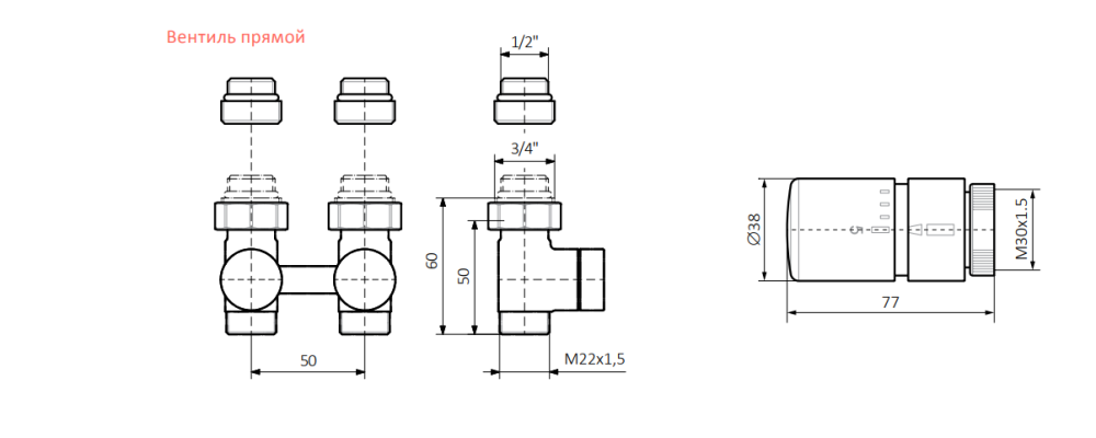 Комплект Теrma интегрированный запорный прямой 50 ось латунь хром