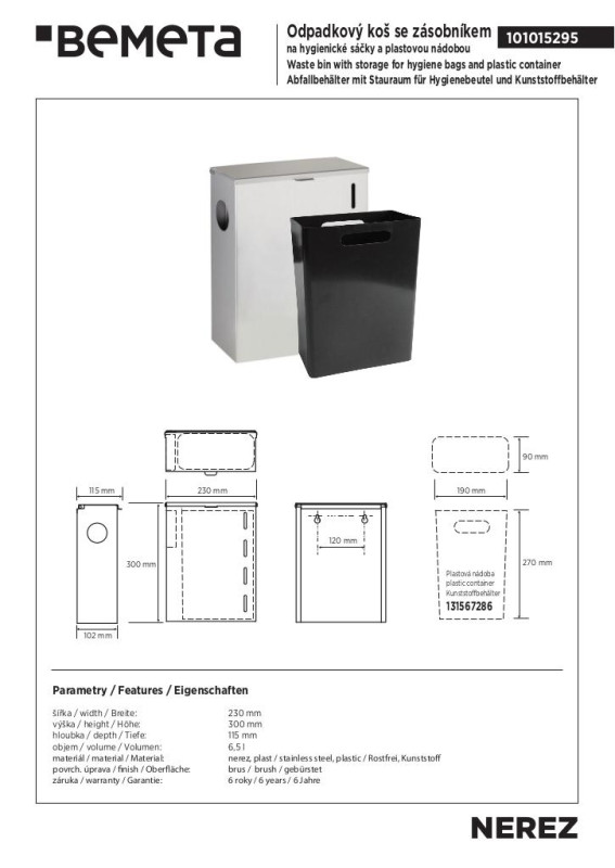 Контейнер для мусора Bemeta Hotel 6,5 л с диспенсером для гигиенических пакетов нержавеющая сталь матовая