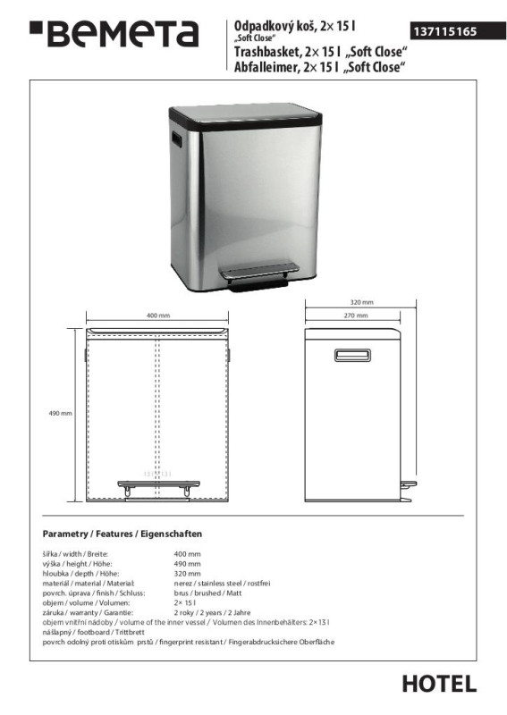 Контейнер для сортировки мусора Bemeta Hotel 2x15 л нержавеющая сталь хром матовый 137115165