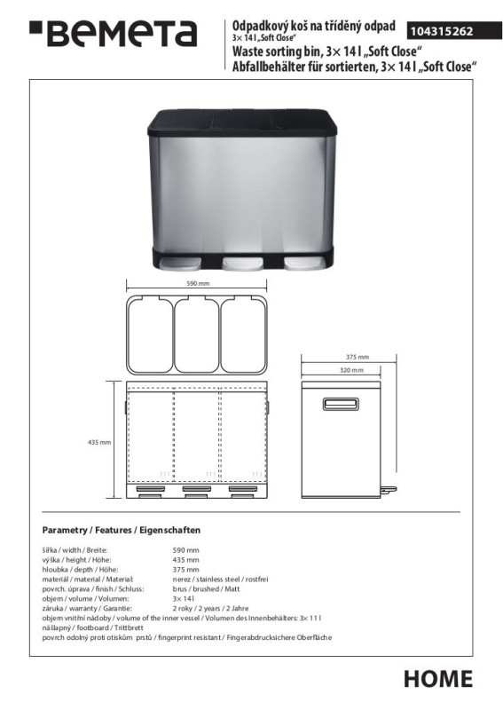 Контейнер для сортировки мусора Bemeta Hotel 3x14 л нержавеющая сталь 104315262