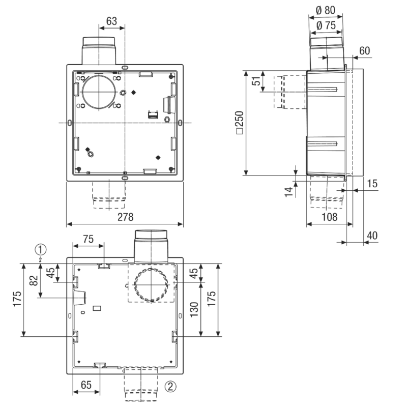 Корпус скрытого монтажа с переналаживаемым пластмассовым патрубком для крепления вентиляторного узла ER EC, с удлинительной рамой на передней стороне, возможно дополнительное присоединение для вытяжной вентиляции туалета
