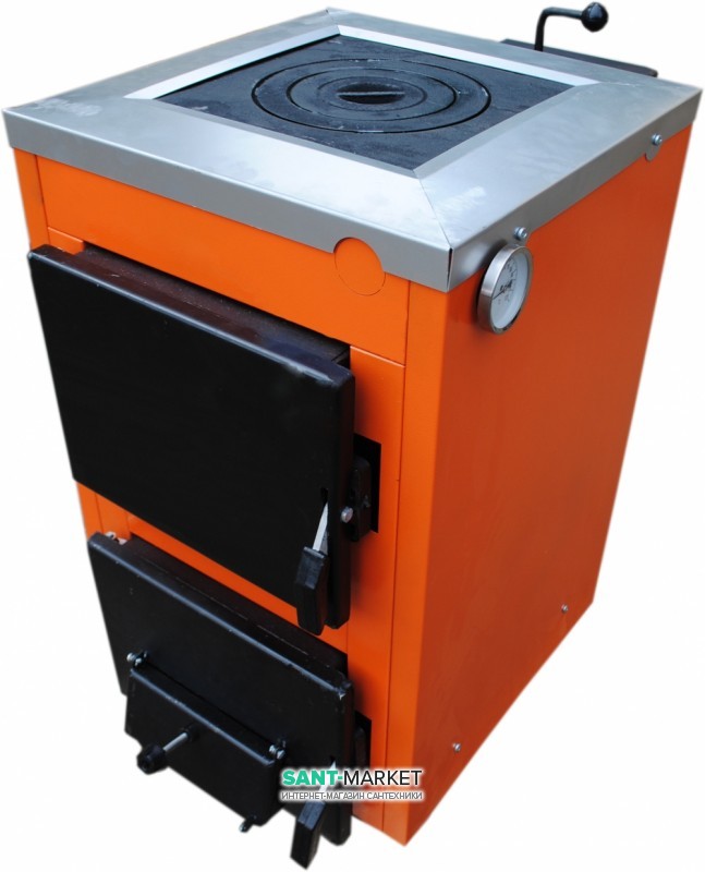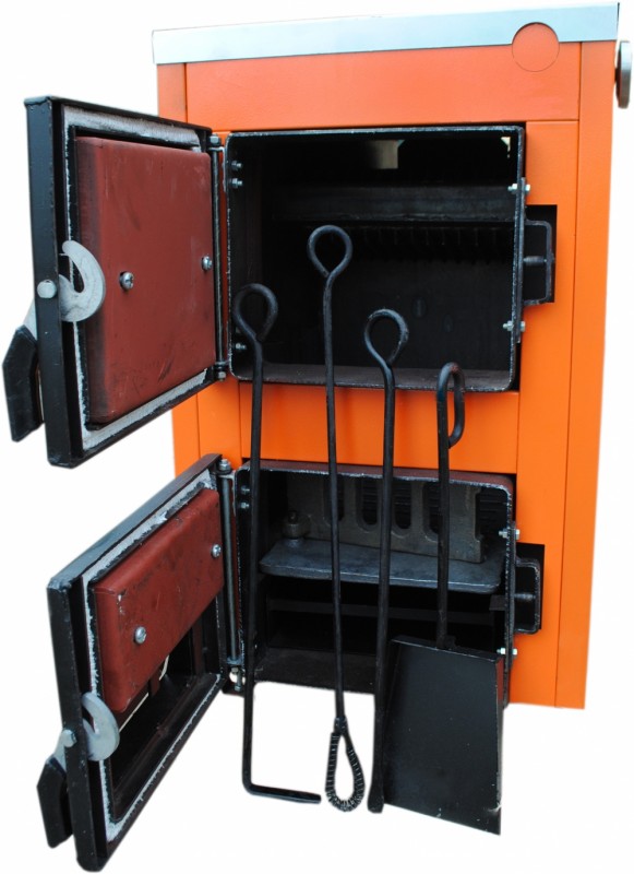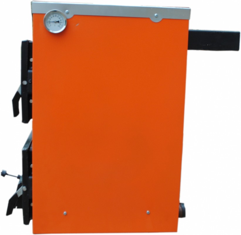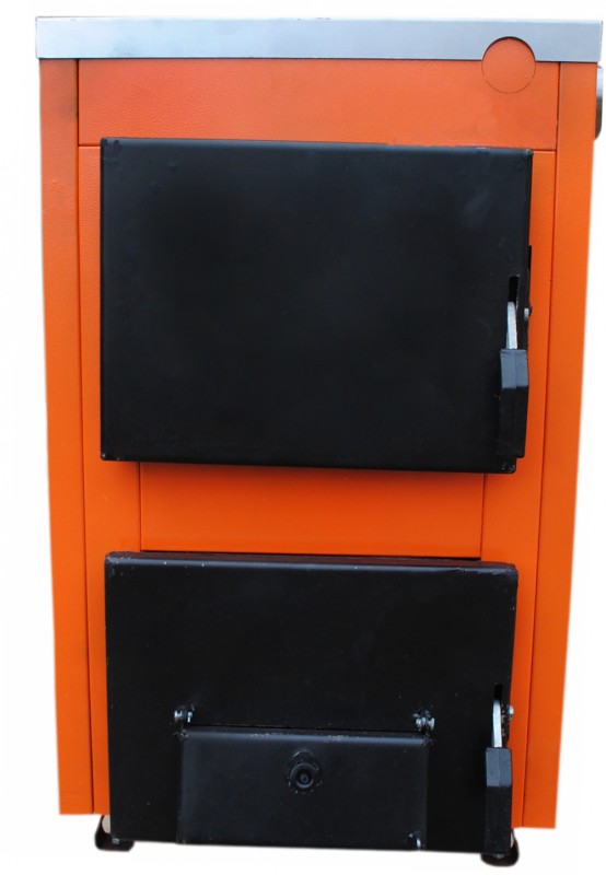 Дверцы котла литые из чугуна, удобные ручки откр./закр. дверки с уплотнительной несгоряемой веревкой, которая препятствует попадание угарного газа в помещение при закрытой дверцы. Есть допустимость подключения механического терморегулятора RTS, который предназначен для поддержания заданной температуры теплоносителя, открывая или закрывая поддувало на котле. При изготовлении котел проходит испытание теплообменника на отсутствие течи при увеличенном давлении, что гарантирует работоспособность приобретенного твердотоплевного котла. Приблизительное время прогорания полностью загруженного котла: 4 - 8 ч, которое зависит от топлива, его влажности и температуры на улице.