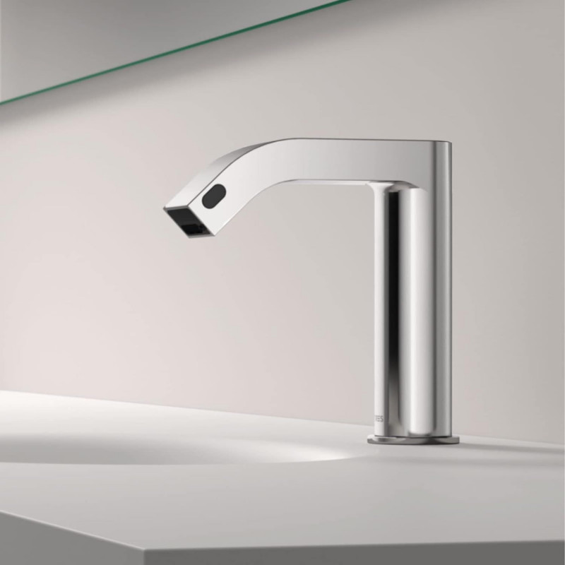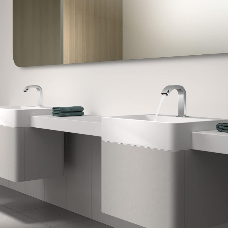 Кран активируется только при обнаружении движения рук. Таким образом, вода поступает только в случае необходимости, что помогает предотвратить ее напрасный расход. Напор воды поддерживается на постоянном уровне 6 л/мин при рекомендованном рабочем давлении 1-5 бар. Работает от сети электропитания и на аккумуляторах, а срок службы составляет 500 000 циклов. Таким образом, смеситель продолжает работать даже в случае сбоя электричества. Если датчик активируется без пользователей, через 60 секунд он отключается самостоятельно, чтобы не тратить воду впустую. При сбое электричества подача воды прекращается автоматически.