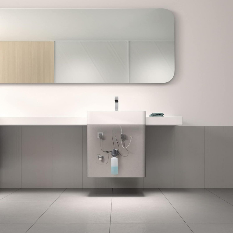 Принцип работы крана очень прост: достаточно просто провести рукой под отверстием излива, чтобы активировать обе функции. Когда датчик обнаруживает присутствие руки сбоку от излива, из дозатора поступает необходимое количество мыла. После того, как пользователь намылит руки, ему нужно поместить их под передним отверстием излива, чтобы началась подача воды. Электронные смесители отличаются простотой использования, минимальным расходом воды и отсутствием необходимости физического контакта, что позволяет поддерживать пространство в чистоте и предотвращать распространение бактерий. Запуск и остановка подачи воды производится с помощью инфракрасных датчиков движения, что обеспечивает ее экономию.