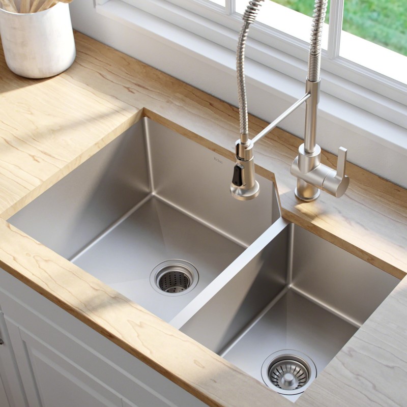 Кухонная мойка Kraus серии Precision из нержавеющей стали – это сочетание стиля и функциональности на современной кухне. Это мойка ручной работы изготовлена из высококачественной нержавеющей стали T-304 толщиной 1,5 мм, что обеспечивает максимальную прочность и долговечность. Экстра-глубокие чаши (254 мм) легко вмещают большие кухонные принадлежности . Углы с ограниченным радиусом и чистые линии дизайна прекрасно вписываются в современные кухни. Все кухонные раковины Kraus оснащены звукоизоляцией высшего уровня, которая включает толстые резиновые амортизирующие подушечки и дополнительное защитное покрытие Stone Guard, которое защищает мойку от конденсата и гасит звук.