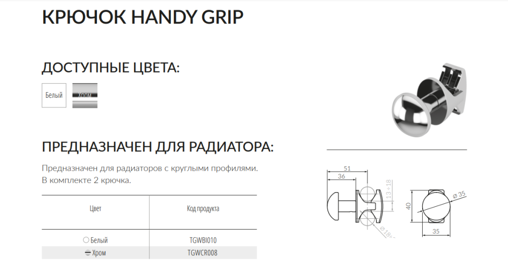 Крючок для полотенцесушителя TERMA Handy Grip металл белый