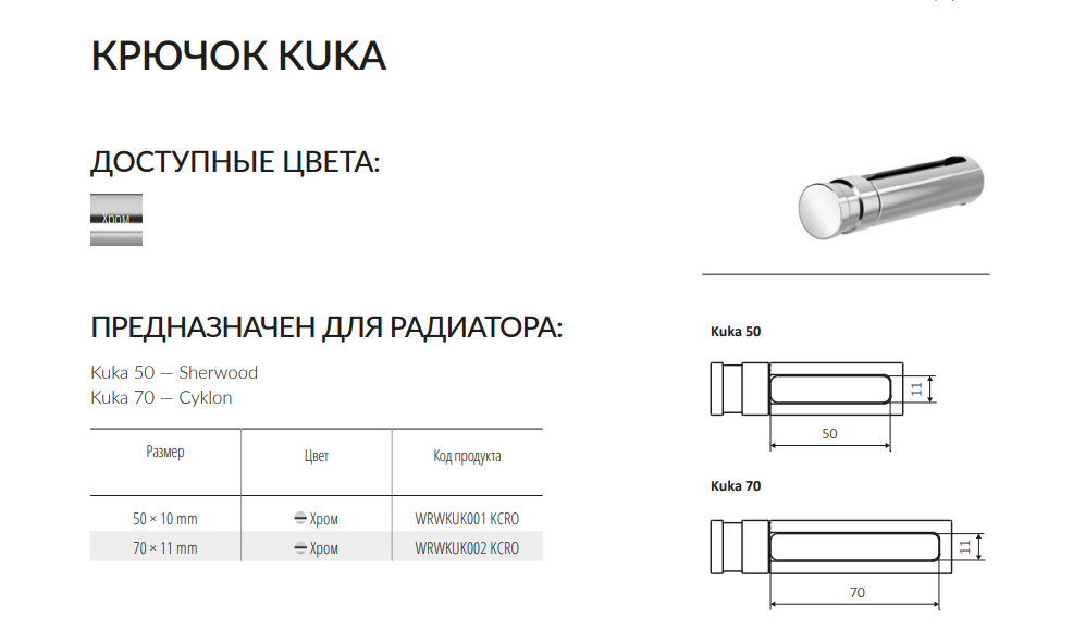 Сдержанный крючок KUKA является интересным дополнением дизайнерских радиаторов Терма. В своих аксессуарах польский бренд сочетает качество, дизайн и практичность. Дополнив полотенцесушитель компактными элементами, Вы получите удобное место для халатов, полотенец и других вещей. Навести идеальный порядок в ванной и не занять при этом много места – вот для чего используют такие крючки.