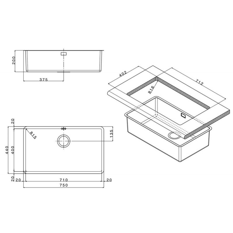 Кухонная мойка прямоугольная Apell Ferrara Plus встраиваемая под столешницу с сифоном нержавеющая сталь Вrushed FEM71UBC