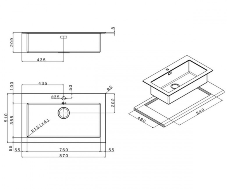 - Размеры мойки (ШхГ): 870 х 510 мм