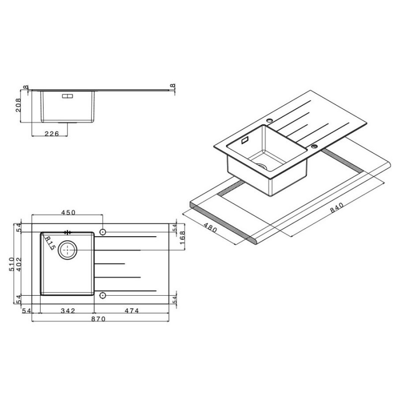 - Размеры мойки (ШхГ): 870 х 510 мм