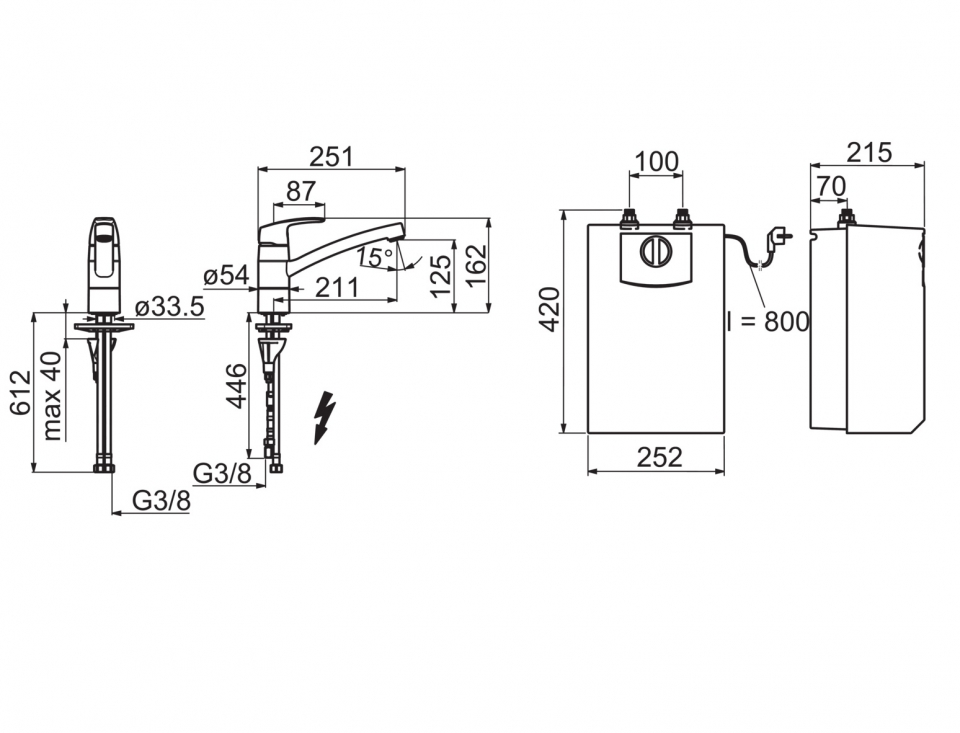 Кухонный смеситель для летнего дома с водонагревателем. Смеситель для кухни с рычагом-петелькой. Поворотный излив и аэратор. Угол поворота излива, установленный на заводе — 100 ° (может быть ограничен до 40 °– 80 °). Максимальный расход воды 5 л/мин. Из-за нагревания воды может подкапывать из аэратора. Это является особенностью продукта и не требует устранения. Конструкцию аэратора нельзя менять или заменять аэратор на другой. Негерметичный водонагреватель объёмом 5л. Лёгкая установка. Диапазон допустимых температур +35 °– 85°C (рекомендовано +65°C) Чтобы предотвратить ущерб от заморозков, смеситель и водонагреватель нужно освобождать от воды. Данный водонагреватель предназначен для работы только с оригинальным смесителем Oras для летнего дома. Смеситель и водонагреватель нельзя устанавливать отдельно друг от друга.