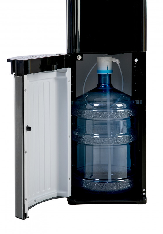 Во-первых, бутыль с водой без особых усилий устанавливается в специальный отсек в нижней части диспенсера, закрывающийся «стальной» дверцей, благодаря чему аппарат будет выглядеть роскошно в интерьере любого помещения.