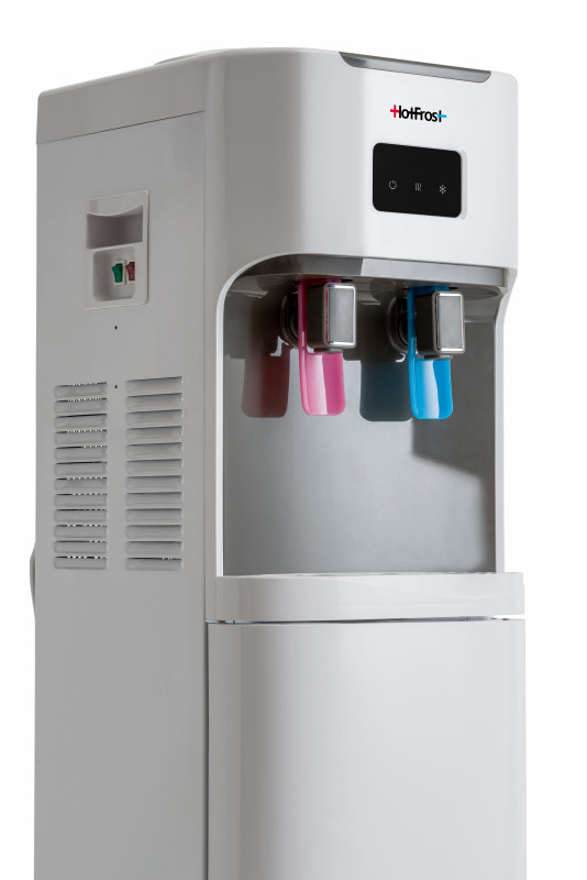 HotFrost V115 оснащен компрессорной системой охлаждения, что делает его полнофункциональным аппаратом. Он отличается высокой производительностью - до двух литров холодной воды в час, и подходит для установки в офисах с многочисленным персоналом. При этом температура в помещении не влияет на уровень охлаждения воды. Увеличенная мощность нагрева делает этот девайс гораздо производительнее, ведь он способен нагревать до шести литров воды в час.