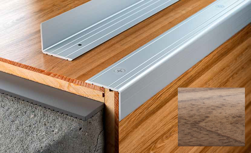 Лестничный профиль S02 с удлиненной вертикальной частью, лучше защищает углы и маскирует неровности краёв ступеней.