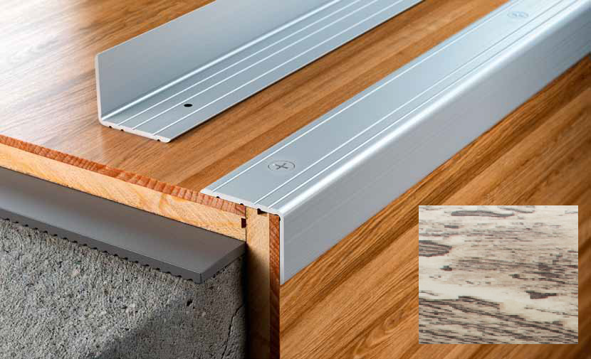 Лестничный профиль S02 с удлиненной вертикальной частью, лучше защищает углы и маскирует неровности краёв ступеней.