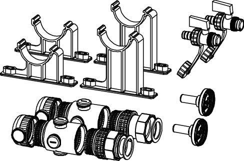 Базовый модуль промышленного пластикового коллектора 1 1/2", модульно расширяемый до 20 отопительных контуров, в комплекте с вентилями заполнения/слива и кронштейнами для крепления к стене.