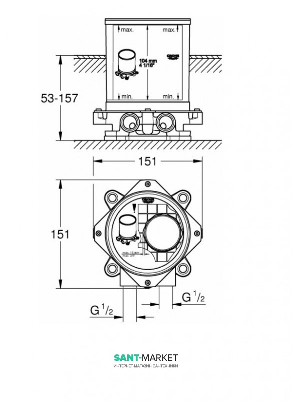 два входа с внутренней резьбой ½″ (подключение горячей / холодной воды)