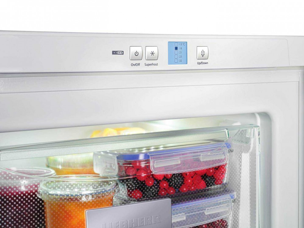 Морозильник (морозильная камера) Liebherr G 1223 Comfort оборудован кнопочной панелью управления с ЖК-дисплеем MagicEye. Функция защиты от детей оберегает от несанкционированного отключения прибора. Перенавешиваемая дверца позволяет устанавливать G 1223 в кухне с любой планировкой.