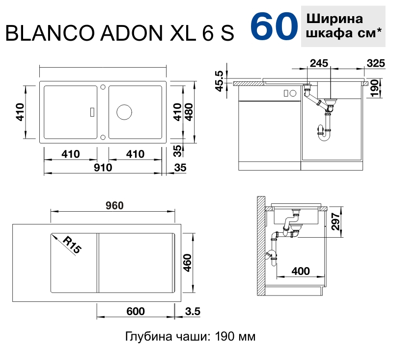 1) Мойка для кухни Blanco Adon XL 6S 91х48 см SILGRANIT® PuraDur® черный
