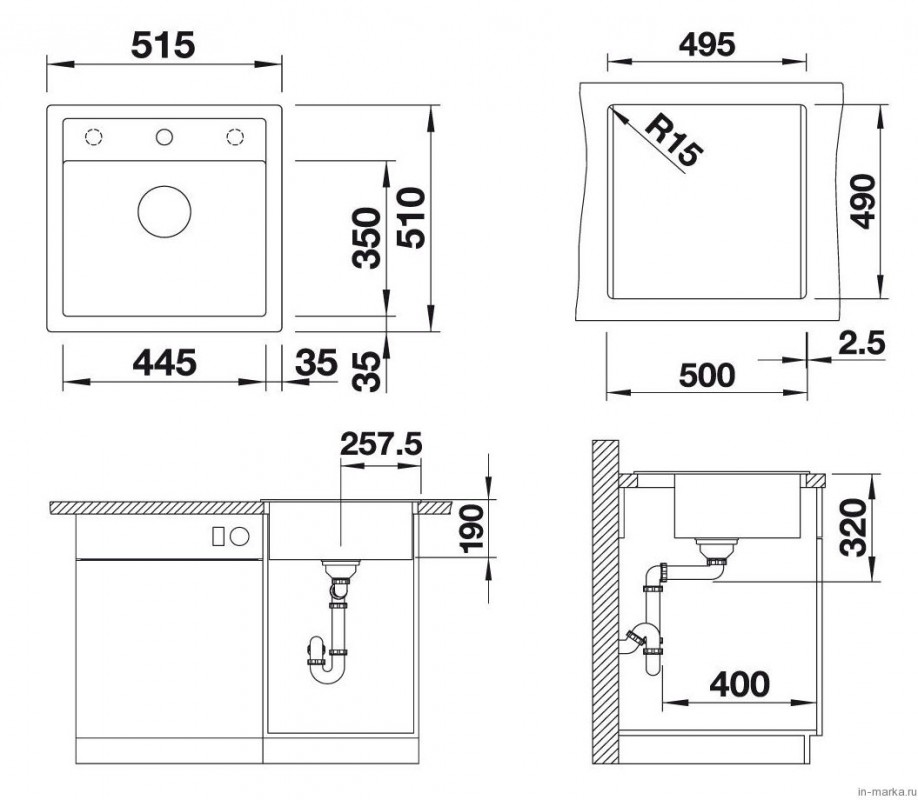 1) Мойка для кухни Blanco Dalago 5 51,5х51 см SILGRANIT® PuraDur® черный