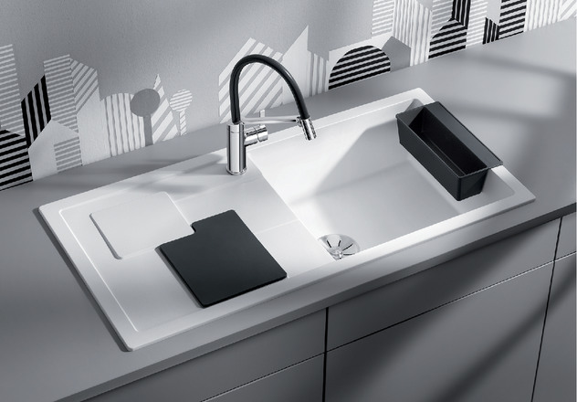 Кухонная мойка Blanco SITY XL 6 S из искуственного камня SILGRANIT™ PuraDur™ с отводной арматурой InFino, гибкой разделочной доской и коландером. Мойка не оборачиваемая, устанавливается в столешницу сверху. В наличие крыло для удобного складывания помытой посуды.