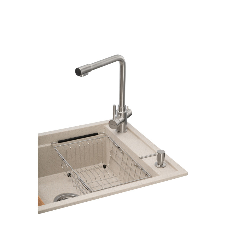 Кухонная станция Optimal – это покупка, которая сделает вашу жизнь легче, а кухню – стильной и функциональной! В одном наборе вы получите не только мойку с сифоном и идеальный смеситель для нее, но и металлическую корзину, разделочную доску и дозатор.