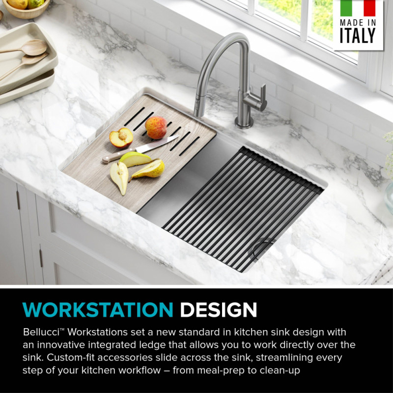 - WORKSTATION: встроенные выступы позволяют вам работать прямо над раковиной с помощью специально подобранных аксессуаров, которые экономят место на кухонном столе