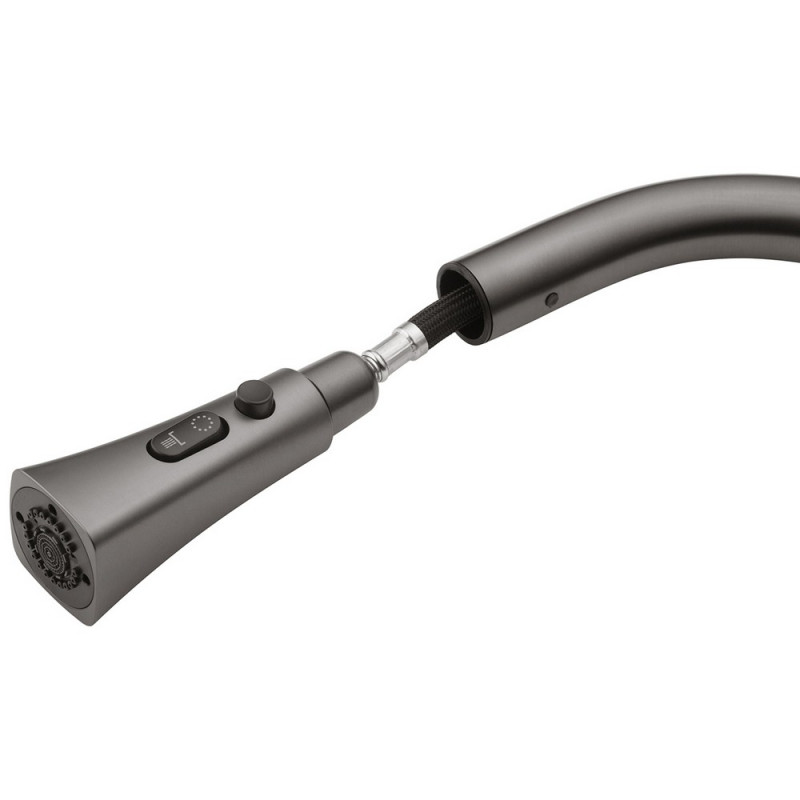 Смеситель для кухни Kroner KRP Makon - GRP030-T из серии Makon отличается стильным дизайном, высоким качеством и удобством использования. Выполненный из прочной латуни с матовым графитовым покрытием, он не только выглядит элегантно, но и устойчив к коррозии и износу.