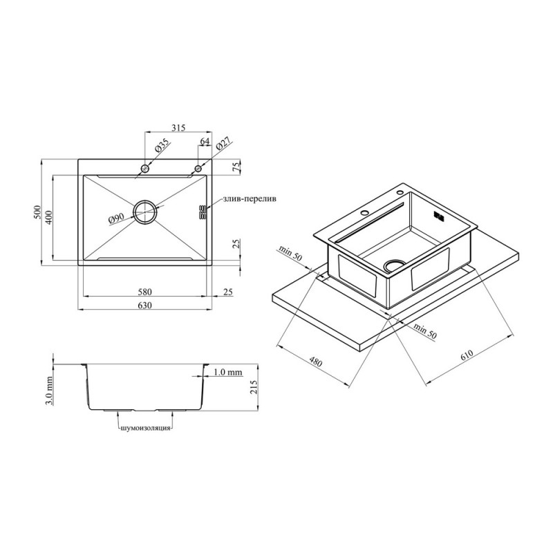 Шумоизоляция и антиконденсат: Мойка полностью покрыта шумоизоляцией и антиконденсатом, что снижает шум при использовании и предотвращает образование конденсата.