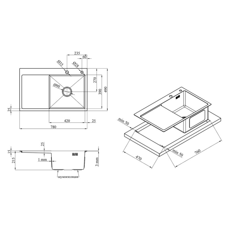 Мойка для кухни Kroner KRP Schwarze-7849RHM 78х49 см крыло слева нержавеющая сталь черный PVD CV025279