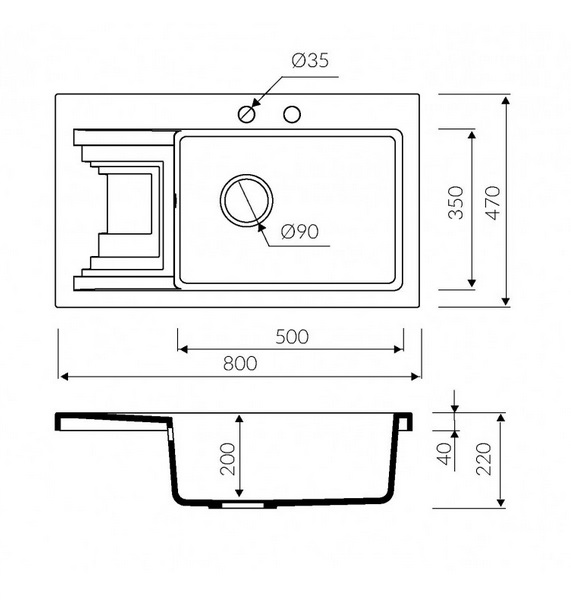 - Диаметр сливного отверстия, мм (дюйм): 90