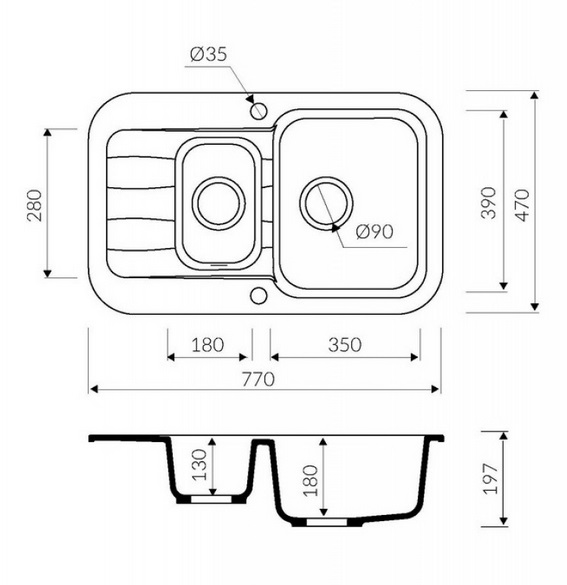- Диаметр сливного отверстия, мм (дюйм): 90