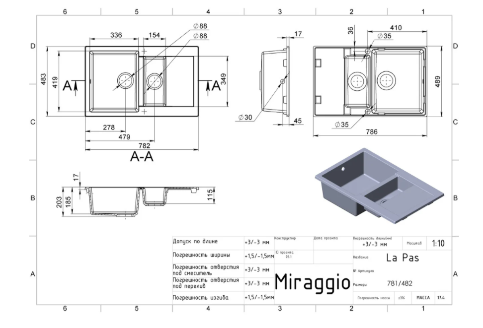 1) Мойка для кухни Miraggio LaPas врезная прямоугольная с 2 чашами с переливом матовый