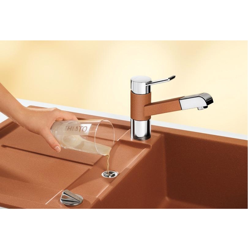 Простота в уходе достигается за счет отсутствия пористой структуры и наличия водоотталкивающих компонентов в составе материала. Это препятствует образованию налета от воды и пятен. Мойка обладает теплым внешним видом материала и устойчивым цветом, который не выцветает даже под воздействием прямых солнечных лучей.