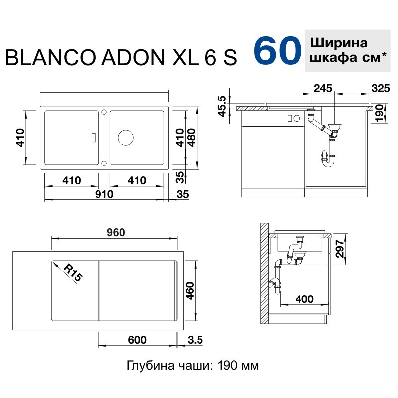 Мойка Blanco Adon XL 6 S выполнена из искусственного камня Silgranit PuraDur высокого качества и подходит для установки в кухонный шкаф шириной 60 см. Глубина чаши мойки составляет 19 см. Модель Adon XL 6 S 525298 производится на заводе Blanco в Германии и на нее распространяется официальная гарантия производителя в течение 5 лет.