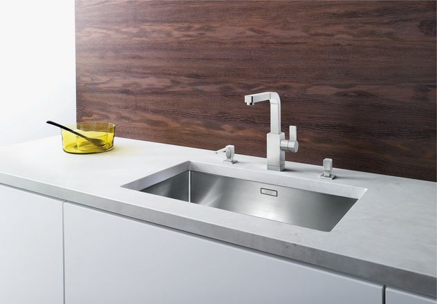 В качестве материала используется качественная нержавеющая сталь, безопасная и гигиеничная для продуктов. Благодаря высоким эксплуатационным свойствам она на протяжении всего периода использования сохраняет идеальный внешний вид, не требуя специального ухода. Блеск поверхности за счет зеркальной полировки гармонично сочетается в дизайне с четкими линиями и маленьким радиусом закругления чаши. Монтаж, выполняемый под столешницу, подчеркивает изысканный и стильный дизайн.